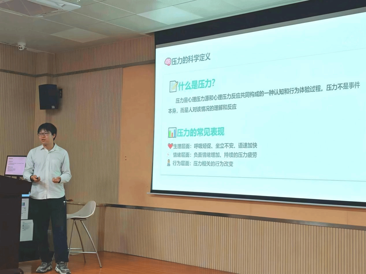 周子健以“科学减压,共筑‘心’防线”为主题,深度剖析学业、人际、就业等大学生核心压力源,系统分享自我觉察法和压力水平评估标准,细致讲解艺术表达法、运动宣泄法等科学减压技巧,帮助同学们树立理性的的压力观,解锁实用心理疗愈方法。同时他也引导大家主动寻求校院心理帮助,通过自我行动干预、外部行动干预主动调适心态,筑牢心理防线。