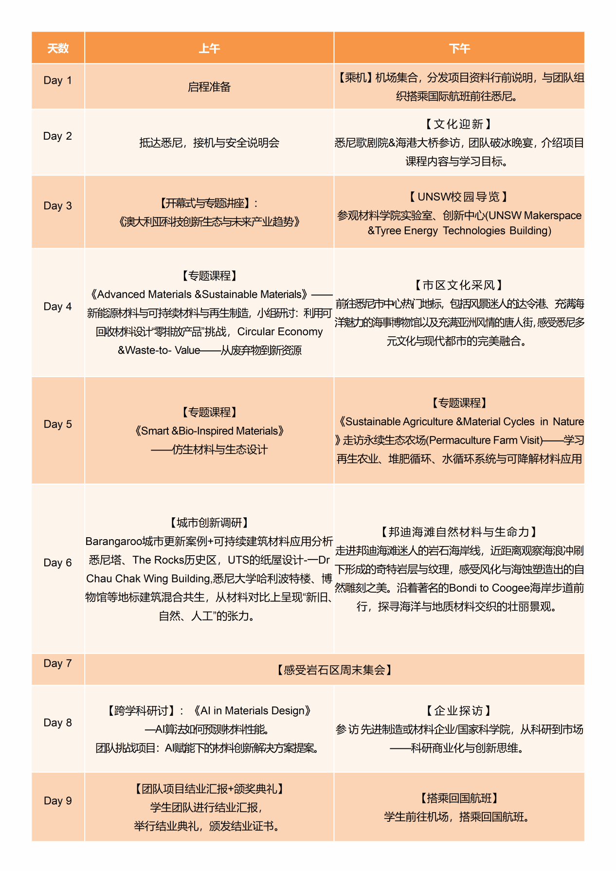 本项目以“未来材料与可持续创新”为核心主线,深度融合材料科学、工程设计、商业创新与前沿未来科技。学生将置身新南威尔士大学一流科研环境,系统研习先进材料的研发、性能测试与产业化全链条路径;依托UNSW材料学科优势及悉尼区域创新生态,将材料科技、可再生能源、绿色建筑与生态可持续理念有机结合。