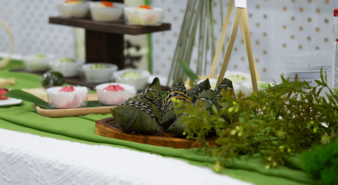 The venue was filled with the refreshing scent of mugwort, with Dragon Boat Festival-themed decorations hanging from the corridors. On the long tables were neatly arranged traditional items such as pastries, zongzi (glutinous rice dumplings), sachets, and mugwort sprigs.