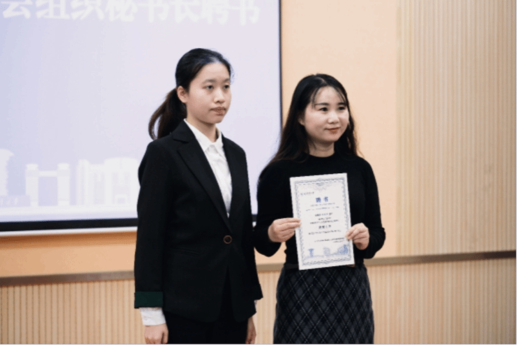 Xu Yang, a member of the Student Union Presidium, announced the Notice on the Appointment of Yang Fenping as Secretary-General of the QMES Student Union and formally presented the appointment certificate.